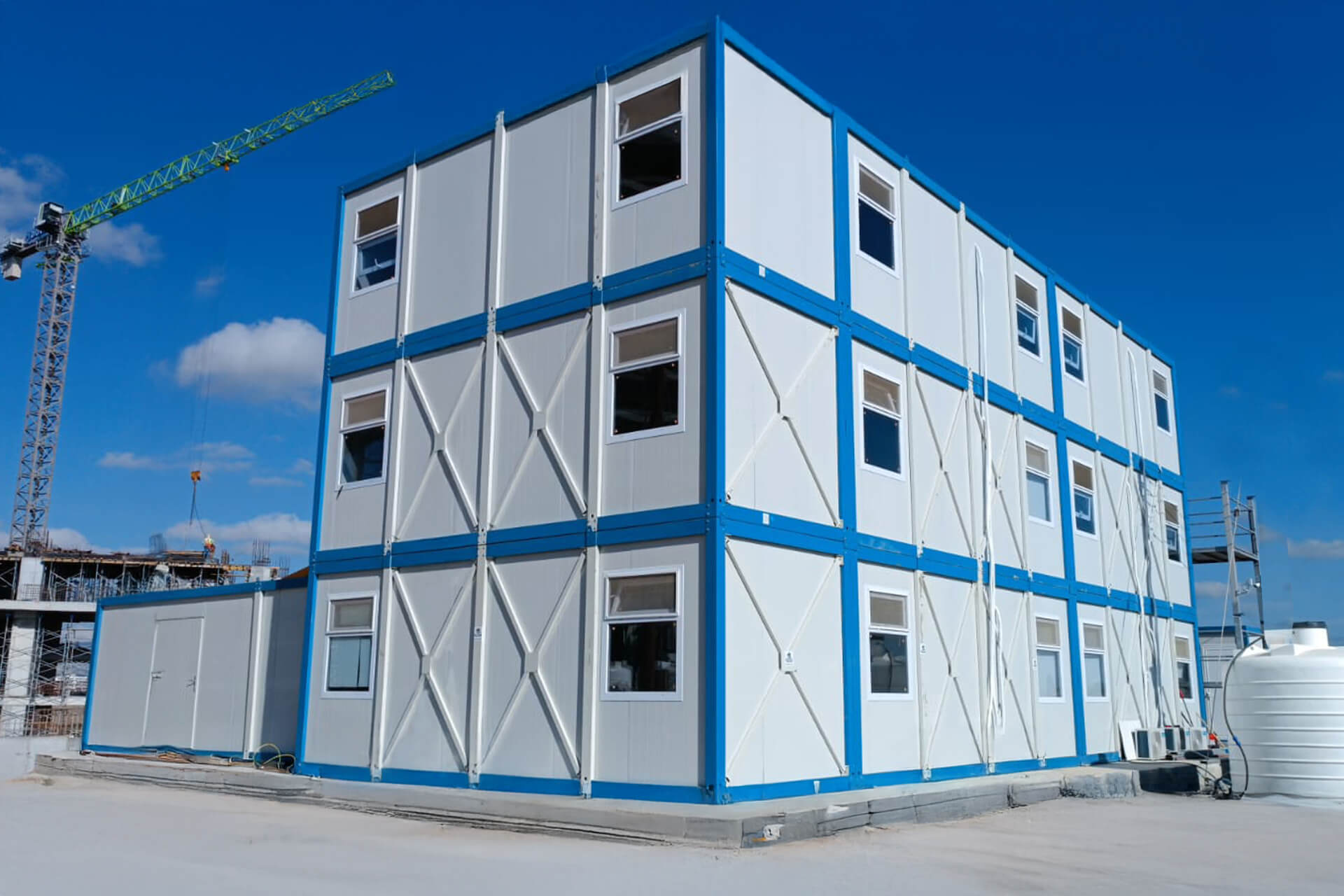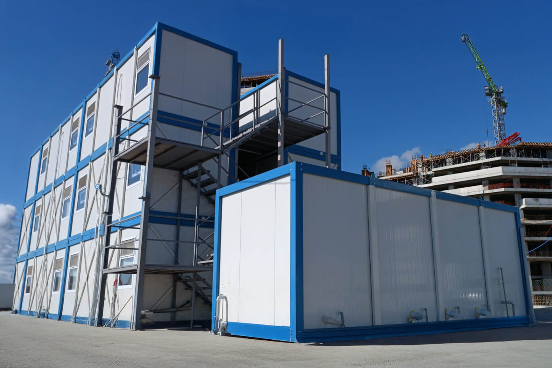 Gazi Mağusa Projesi Konteyner Yapılar ve İşçi Yatakhaneleri: İşçilerin ofis ve yatakhane alanları konteyner sistemleriyle inşa edilmiştir. Bu sistem, hızlı kurulum, taşınabilirlik ve dayanıklılık gibi önemli avantajlar sunarken, projedeki her türlü talebe uyum sağlayabilecek esneklik ve modülerlik sağlamaktadır. Konteyner modülleri, farklı yapı gereksinimlerine göre tasarlanabildiği gibi iki katlı veya üç katlı olarak yapılandırılabilir. Bu sistem, projelerdeki konaklama ihtiyacını hızla karşılayarak esnek bir çözüm sunmaktadır. Konteyner sistemleri, özellikle saha projelerinde yer kısıtlamaları olduğu durumlarda hızlı çözümler sunmaktadır.